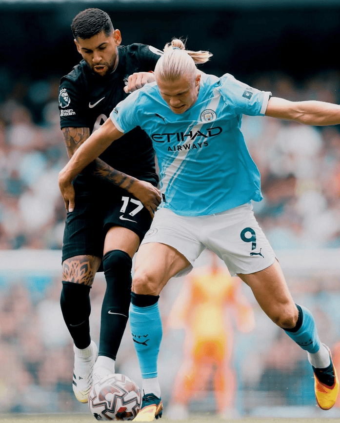 在弗兰克上任之后,热刺一改此前的激进风格,此役客场用防守反击和高位压迫和曼城周旋,尽管控球率处于劣势,但一上来就连续完成前场抢断,给曼城的后防线施压,尽管场面上略显被动,但蓝月军团还是在第28分钟率先制造杀机,哈兰德前场带球送出直塞,可惜马尔穆什的单刀机会没有把握住,被维卡里奥神勇扑出。